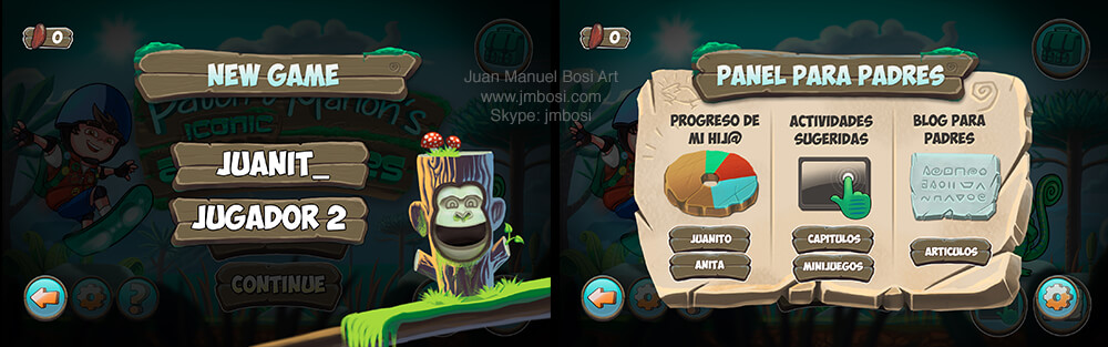 GUI Design, New game screen (left) and Parent´s panel screen (right)