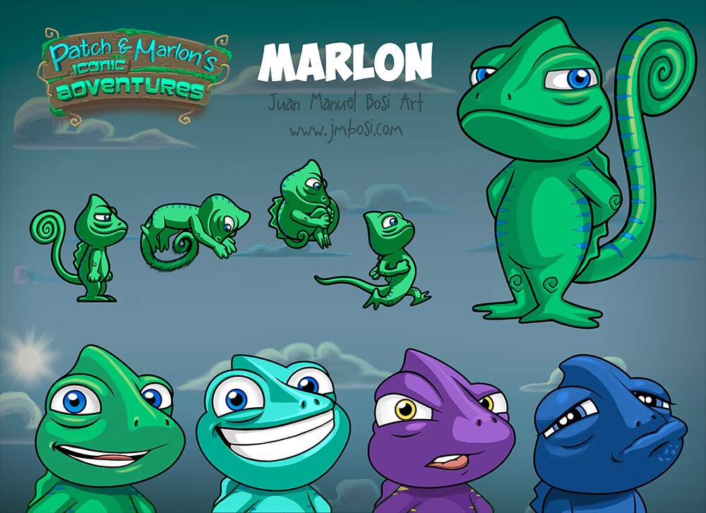 Character design, chameleon cartoon, animal cartoon design, 2D animation, Marlon